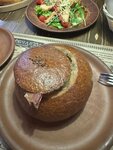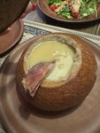 Гуляли с сыном и зашли покушать, взяли гороховый суп в хлебной корзине, к нему идет копченое ребро, мне суп понравился, вкусный. Хачапури по аджарски это в принципе любовь, мы всей семьей их обожаем, ещё сын брал шашлык-очень мягкий, вкусный, а какой вкусный соус к мясу был ммм. Несмотря на то, что в зале было много гостей, нас обслужили быстро👍