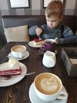 О, это опасное место для тех, кто любит тортики ☺️ кофе очень вкусный, я беру обычно флэт уайт. Брала тортики, блинчики, десерты в стаканчиках (на вынос). Еще была два раза с детьми. Там отдельный столик для детей и много игрушек. И полка с книгами. Вобщем супер место!