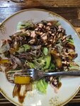 Посетили кафе «Колхида» с большими ожиданиями, но, к сожалению, еда не оправдала их. - Тёплый салат с куриной печенью — в основном состоял из пережаренной печени, лука и перца. Блюдо получилось тяжёлым и невкусным. - Грузинский салат — спасал ситуацию благодаря грецким орехам, но в целом тоже не впечатлил. - Харчо — пресный, хотя мяса было достаточно. - Картошка с говядиной под сырной корочкой (не запомнили название) — выглядела красиво, но на вкус оказалась невыразительной. Плюсы: - Интерьер симпатичный, выполнен в грузинском стиле, создаёт уютную атмосферу. Минусы: - Еда оказалась пресной. Ожидали более ярких вкусов грузинской кухни. Возможно, нам просто не повезло с выбором блюд, но в следующий раз, скорее всего, попробуем другое место.