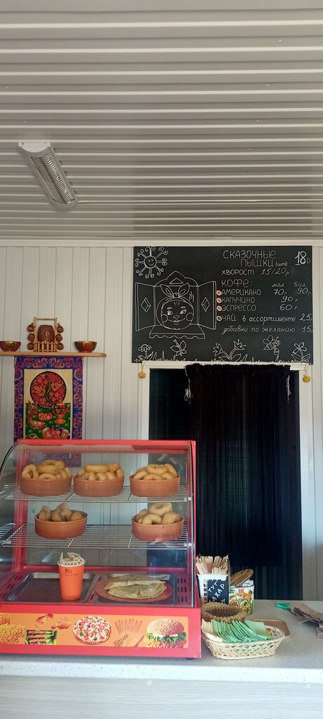 Самый лучший кофе в радиусе 30 км. Ребята владельцы заказывают специально бразильский в зёрнах со сладковатыми нотками во вкусе. Кроме пончиков есть ещё плацинды с творогом и зеленью,картошкой, кутабы с зеленью. Цена в районе 40-45 руб. Пончики по 18руб за шт. Есть детский уголок с игрушками,книжками. Ребенок там спокойно играет мин 20-30 точно и у меня есть время спокойно кофе- чай выпить. Хозяева они же кассиры и повара очень приветливые люди. Надеюсь летом откроется веранда, так как вид на горы из окон очень красивый, а с верандой обзор был бы ещё лучше