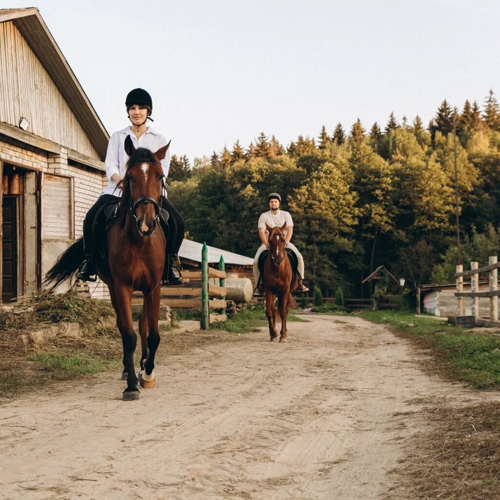 For the first time, my wife and niece visited the farm with a gift certificate in May 2024 - a 1-hour walk (taking into account the terrain and the level of training), followed by tea and homemade cheese. The impressions are the most positive, and the cheese with lingonberry sauce is absolutely magnificent!!! The second time my wife and I (on my initiative) went on 04/28/2025 for a 1-hour walk (taking into account the terrain and the need to restore shape in conditions of very peculiar loads on the body). Perfect (!!!) We walked along the edge of the field along the edge of the forest, climbing and descending into the valley of the stream a couple of times and fording the stream. Therefore, for the third time (05/01/2025), the program was ordered and implemented.: - a master class on cleaning, saddling, unbridling, bridling (the need to restore skills lost many years ago), as well as hoof cleaning (we have never done this before. SUCCESSFULLY!!!; - 2 hours of walking (taking into account the terrain, the level of training and the need to restore riding skills) through fields, forest paths and paths, through the forest without a path, descents, sometimes very steep, into / out of the valley of streams and rivulets, along a gravel road, etc. From a distance of ~300 m, a herd of roe deer and a fox were seen running through a field. We admired the landscapes of the burgeoning nature; - Upon returning to the base, we unsaddled the horses ourselves, took them to the stalls (saddled and bridled, as you understand, also independently as part of the master class), unbridled them and drank tea with the same wonderful homemade cheese. Everything was successful!!!! We will return as soon as possible - we need to explore the surroundings already, if possible, at a trot!!!! By the way, horses are equipped with competitive saddles, if that's important to anyone. Sincerely, Vladimir, Oksana!!! Had a great time!!!