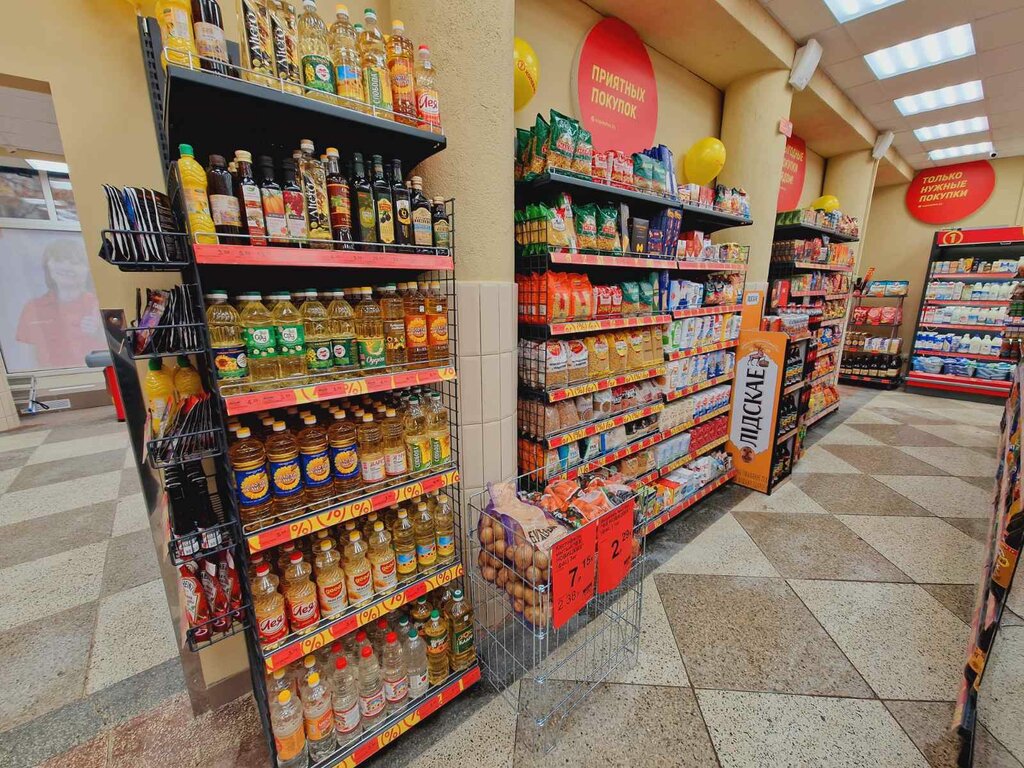 The kopeechka store has a coffee machine, what to eat, and a very good location is very convenient.The store, like almost all stores, has fruits, vegetables, meat and dairy products, and sweets, just like in most kopecks.