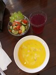 Приехали группой из Оренбурга и первый обед у нас прошел в столовой "Кориандр". Чистый зал, столы были накрыты. Уха из красной рыбы на сливках с сыром, запеченный картофель с куриной рубленной котлетой, салат из свежих овощей и компот. Обед вкусный. Спасибо за хороший прием!