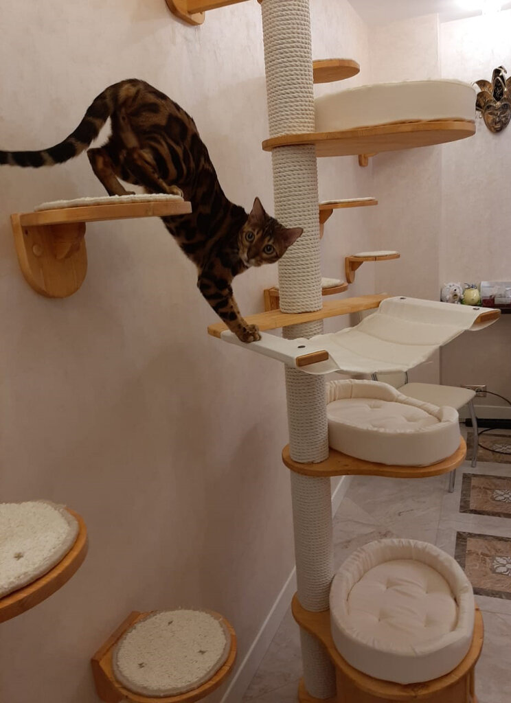 Компактный, многоместный комплекс для кошек, с надежным креплением к стене. Не занимает много пространства в помещении. Удобно располагается как вдоль стены, так и в углу помещения. Подходит для одного или нескольких животных.