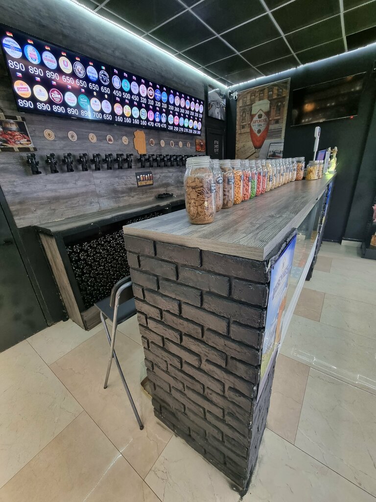 Большой выбор немецкого пива на розлив. Так же имеется Чехия, Бельгия, много Российского крафта, так же имеется несколько холодильников с импортным и Российским пивом, много закусок.