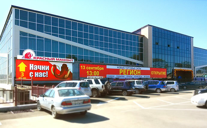 Огромный маркет строительных материалов под названием Регион. На втором этаже Красный мамонт. Здесь потрудились дизайнеры, оформлены образцы кафеля, сантехники, отделочных материалов. Если не готов к ремонту, то здесь предложены варианты на любой вкус.