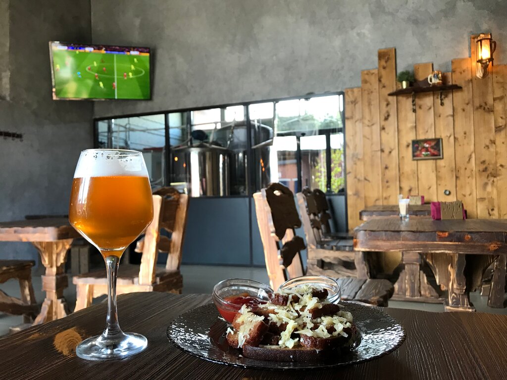 Свежее, нет, свежайшее пиво! 🍺 6 столиков в баре, рассчитанные на 3-6 человек. Есть закуски системы снеки. Цена на вынос заметно дешевле, чем при употреблении на месте. Два больших телевизора по углам. За стеклянной стеной бара расположена пивоварня - отличное дизайнерское решение, добавляющее изюминку. Видно как пивовары стараются. 🙂 Дизайн в целом неплох. Мебель массивная, как и должно быть в пабе 👍