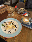 Это кафе открылось во времена моей учебы в старших классах в школе напротив. Помню, как пару раз заходили сюда с подругами после уроков. Было любопытно прийти и посмотреть, что же изменилось спустя более 10 лет? Удивительно, но ничего: ремонт, интерьер, мебель — все сохранилось с тех времен. И это очень плохо, ребята. Стиль лофт был свеж тогда, 10 лет назад, сейчас же он просто неумело прикрывает уставшую обстановку. В санузле просто страшно находиться — грязная сантехника, двери и стены исписаны всякой чушью. Стол, за которым мы сидели, ходил ходуном. Вытяжка не тянет от слова совсем — в кафе стоит интенсивный запах еды. Играет в зале почему-то современный англоязычный рэп. Столы стоят скученно, тесно. По еде — раньше акцент был на блинах, их было больше разных видов, сейчас же меню стало разнообразнее, но за счет основных блюд и закусок. Выбор по блинам все же есть. Блин с индейкой и сыром Чеддер на вкус как чикенбургер из макдональдса — не плохо, но и не хорошо. Блин с говядиной — тоже без восторга. Сладкий блинчик с нутеллой и бананом понравился больше всего, но такое вкусовое сочетание — это уже классика, его сложно испортить. Щи с говядиной понравились. Кофе неплохой. Ждали суп 20 минут, блины около 25 минут. По цене: 3 блина + щи + средний капучино и чайник пуэра 3000 рублей. Цена, очевидно, обусловлена проходной локацией, иначе… Даже не предположу, чем? Две звезды только за сносную еду и замечательную, внимательную официантку (имя, к сожалению, не запомнили). В остальном — все печально, поностальгировать не получилось.