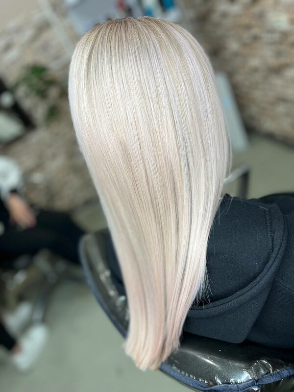 Комплексное осветление по всей длине до светлого или платинового оттенка. Результат — равномерный, сияющий блонд с холодным или теплым подтоном, без рыжины и резких переходов.