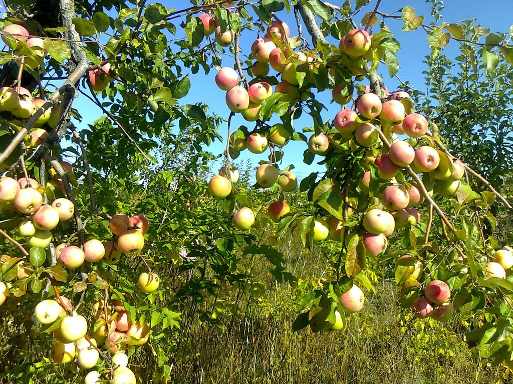 Огромные кварталы яблоневых насаждений с вкусными плодами.