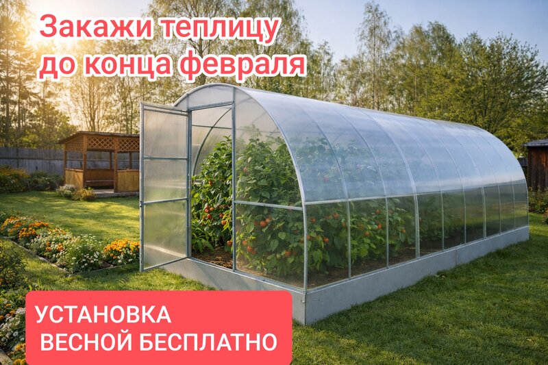Каркас усиленный из профильной трубы 20х20х1,5мм, дуги через 66 см, 5 прожилин. Ширина- 3м, длина- 6 м, 2 двери+2 форточки. Поликарбонат: 4мм. с УФ-защитой. Основание: шлакоблок+брус 100х100, монтаж, доставка.