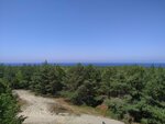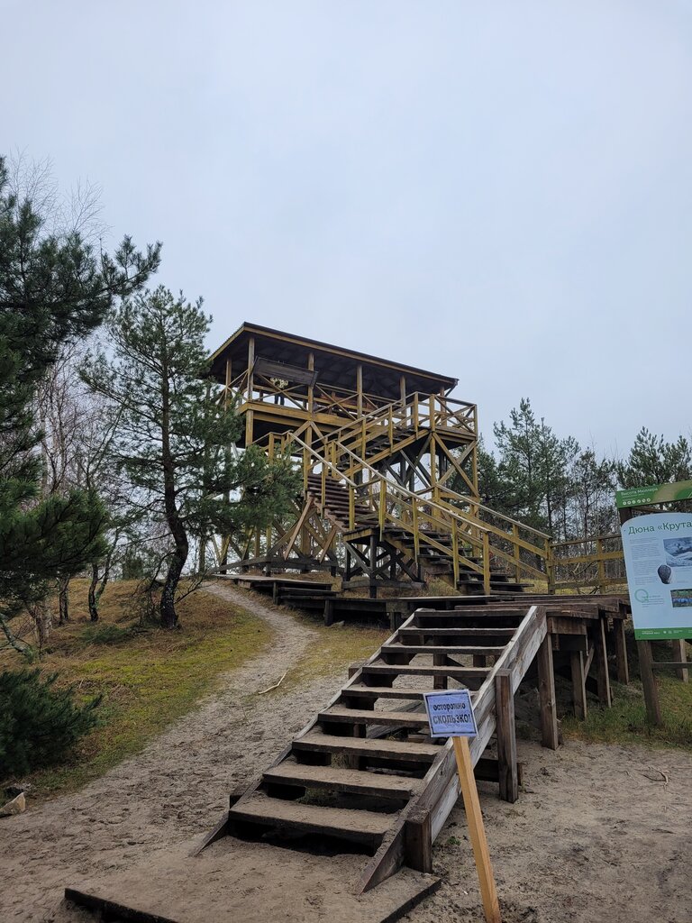 Вершина Миллера (гора Крутая)По моему мнению одно из самых интересных природных мест Куршской Косы. Вниманием туристов несколько обделена, и поэтому особенно интересна. Парковка небольшая. Для автобусных экскурсий не подходит. Если на легковом авто -, заезжайте обязательно. На парковке туалет и один фудтрак с глинтвейном за 350₽))). Тропинка с парковки уходит влево и вправо. Уходили вправо. Плавный подъем через крупный реликтовый сосновый лес по песчаной дорожке. На верху стенд с видами мхов и лишайников. Очень интересно. Начинается деревянная дорожка. Почти до самой наблюдательной вышки. Очень интересный мелкорослый лес по сторонам. Деревья полностью покрыты мхами и лишайниками. Есть две тропинки влево ( уходит через крутую лестницу назад на парковку) и вправо - на Аван дюну и море. На вышке -стенды с описанием лесозащитных работ в этом месте. Внизу памятный камень главному идеологу высадки леса на дюнах Миллеру. Хороший вид на озеро и лес. Чуть возвращаемся и уходим по тропинке в сторону моря . В меру крутой спуск через кедровый сланник заросли мхом и лишайниками и попадаем в сосновый лес. Деревья забавно наклонены в одну сторону. Далее по низине выходим на авандюну. Красивые виды. Ходят звери)). Туристов сильно меньше чем в иных местах. Виды красивые. Аншлагов с надписью" сход стропы 4т.₽" не замечено. Побродили с удовольствием полтора часа. Понравилось взрослым и детям. Однозначно рекомендую.
