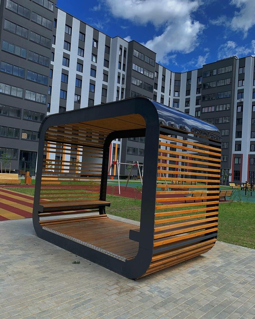 You can't hide from the rain and sun in such a "gazebo". I wonder who came up with this idea and what guided it... There are 0 points for the idea, 2 for the execution with a stretch. The wooden sticks that make up the gazebo break in weak spots. Now the residents will do something with the roof at their own expense, because this is some kind of horror.