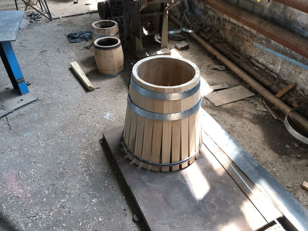 Материал: Колотый дуб. Высота: 31 см. Диаметр: 27 см. Толщина клепки: 18-19 мм. Комплектация: подставка, пробка