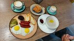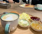 Ходили на завтрак. Кофе вкусный. Круассан и хлеб нет, не вкусные бутерброды, они просто ни о чем, понравилась яичница с ветчиной и сыром, сырники по-разному, когда норм были, когда нет. Брали завтраки за 300 (французский, баварский и тд) - средненько. Кушали суп и пиццу, ничего так. В целом приемлемо, не все, но поесть можно. Интерьер норм