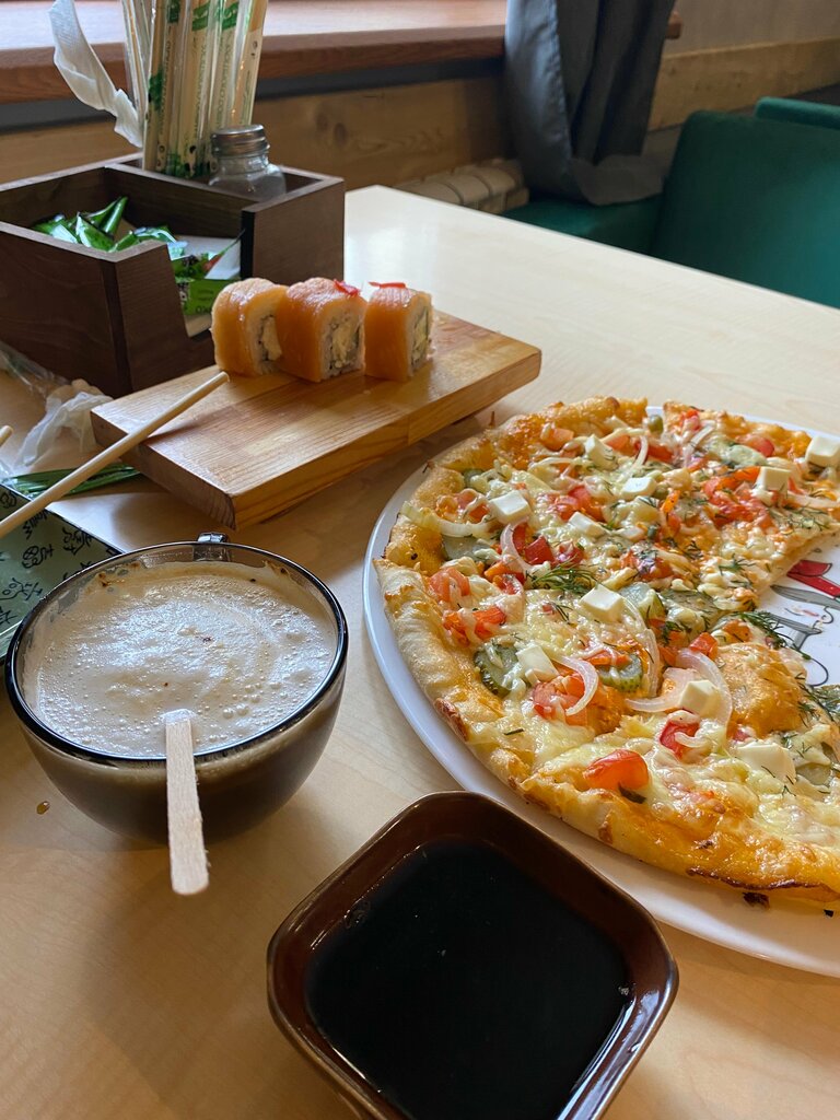 Покупал тут суши и пиццу, 3 из 5, пицца честно сказать в Ермолино лучше купить, будет вкуснее, а суши, я не знаю, нет вкуса в них. Но 3 звезды потому что обслуживание отличное, сервис хороший, а еда на вкус и цвет, может вам понравится, мне не зашло)