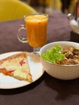 Очень понравилось местечко, пришли с друзьями,искали веганское! Везде прописаны составы:брали комбо, буритто,2 вида пиццы, момо с тофу и напитки, нас угостили котлетой и сладостями, понравилось,что все свежее, цены достаточно низкие, как для веган меню еще и при таком выборе(хотя многие тут писали иначе, но для нас это прям очень вкусная стоимость, а мы были во многих веган местах)выбор большой,но из минусов: часть меню в стопе из-за этого самого объема, однако это очень частая проблема при попытке отхватить большой кусок разнообразия (фиксится)ну и частично заведение требует ремонта в некоторых моментах ) Но понравилось,что можно взять еду как с витрины , так и заказать новое. А еще удивило ,что в свободном доступе стояли соусы (Вег сметана и кетчуп ) и зелень для того чтобы брать сколько хотелось бы, еще нигде такого не видели,очень круто . Сотрудницы приветливые, ощущается,как домашняя вкусная столовая, десерты в меру сладкие,есть варианты как пп , так и простые человеческие варианты (часто в таких местах считают, что если ты отказываешься от эксплуатации животных, то тебе чужд сахар ,глютен и простая человеческая радость)Зашло даже другу невегану,ел комбо( суп+ салат+ пицца+ напиток + хлеб - супер сытно и всего 460р), буррито вкусный, начинки много ,но больше похож на шаурму исходя из состава,момо похожи на вареники с творогом(к ним идет Вег Сметана). Котлеты из чечевицы божественны(они готовят их 3 дня и мы даже взяли рецептик, но скорее всего лень победит и есть мы будем их исключительно по приезде в Краснодар), в продаже есть высший вкус,вего,чай ,масла собственного отжима, благовония и штуки по буддизму. Однозначно рекомендую к посещению, а кафе желаю роста и процветания , к сожалению таких мест все меньше ( почти не фоткали ничего было слишком вкусно 🫶🏻 все съелось быстрее)
