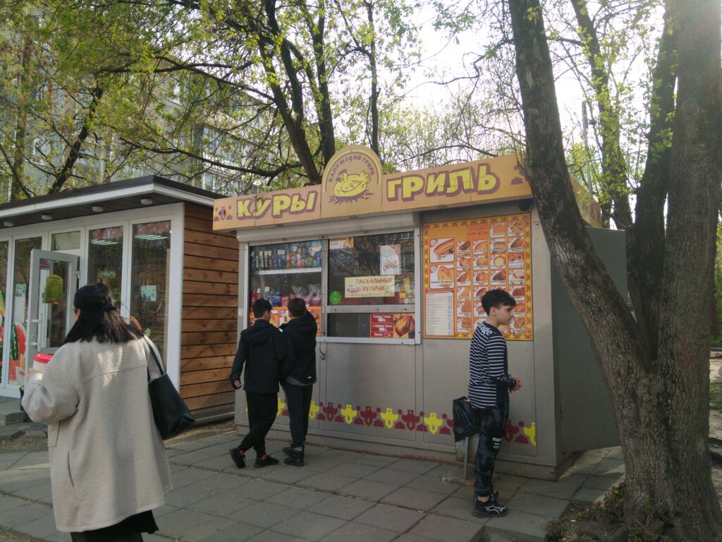 Покупали 18.04.22 здесь куру гриль, хот-дог, гамбургер и пиццу с курицей. Хот-дог и гамбургер оказались не особо (ну мы ничего от них и не ждали), а вот пицца с курицей и кура гриль очень понравились 👍 Курица сама по себе небольшого размера, но оказалась очень вкусной, особенно жирок и шкурка. Продавец спросила посыпать ли чесноком - конечно посыпать! Очень вкусненько оказалось(ещё за 35 рублей её обернули в лавашик - не знаю так и запланировано ли, что положили в 2 лаваша, что огромный плюс🔥). Покупку делали в районе 18:00, готовая курица была в наличии, продавцу отдельное спасибо: вежливая и прям приятно с ней общаться ❤️ Не знаю, влияет ли время покупки на сочность курочки, но у нас она была не сказать, что сочная, но достаточно мягкая и полностью готовая прям максимально: мясо прям соскальзывало с костей (как будто она пару часиков уже висела готовая). Для нас это оказалось плюсом, мы любим такую. Но еще раз подчеркну - кура была не сухая, но и жира/сока не было особо. Если кто любит посочнее, возможно стоит прийти на пару часиков пораньше (но это не точно, я не знаю, в какое время они куру начинают готовить). В целом, мы остались довольны, курица практически как в детстве на вкус была, ну только менее маслянистая. Всё-таки раньше куры были помаслянистее/пожирнее) но это всё на любителя))