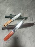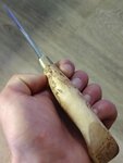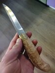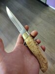 Заказал для рыбалки финский Пуукко с рукоятью из Карельской берёзы, а так-же со скидкой кухонный нож "Мясник", оба ножа класс, сталь и заточка 🔥, вопрос только к рукоятке обоих, а именно у кухонного, мое мнение, рукоять нужна объемней где-то в сантиметр, чтобы нож ощущался более уверенно в руке и будет проще резать мясо, сало замороженное, овощи для мясника вообще " семечки". Больше всего интересен тот факт, что на финском пуукко нет упора на рукояти для указательного пальца, ведь нож преподносится как помощник рыбака или охотника, хотя может это в угоду законодательства РФ🤔🤔 При разделки слегка крупной, до 4кг, трески или зубатки нужно быть очень осторожным, чтобы рука не соскользнула при отделении головы. Сама покупка происходила по предоплате с электронным кассовым чеком в 1000 р, неделя из Дзержинска до Мурманской области, остаток после осмотра на почте. Сотрудник почты, а это была девушка, была, мягко говоря, в шоке от состава посылки))) P. S. И да, кстати, нож пуукко был в ножнах из свиной, как мне кажется, кожи, клепанной и прошитой, да и петля под ремень имеется.. В общем и целом рекомендую нож "Мясник" на кухню, я только им сейчас пользуюсь, и финский нож пуукко на рыбалку, но с осторожностью))). Всем добра! P. S. S. Кстати, на каждый нож предоставляется сертификат соответствия, понятное дело что при желании можно "нарисовать", но блин приятно, а так-же огромное спасибо человеку, с которым я общался, что все объяснил и рассказал!