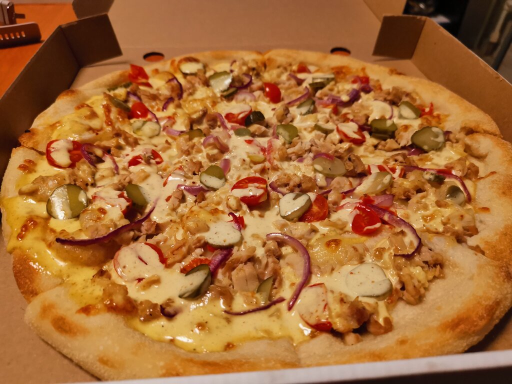Вкус Бургера в Итальянской Пицце. Состав: Томатный соус, сыр Моцарелла, сыр чеддер, говядина, маринованные огурцы, красный лук, кетчуп.