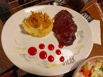Отличное место, вкусная еда. Брала сезонный салат из свеклы, мясо разное, один раз было слегка жестковато, а другой раз другое блюдо тоже из свинины (оно на фото) было настолько нежное, что нож не понадобился! Молочный коктейль Сникерс по сути обычный молочный коктейль просто с красивой подачей - шапочка из сливок, немного тертого шоколада и арахис. В кафе понравился интерьер
