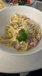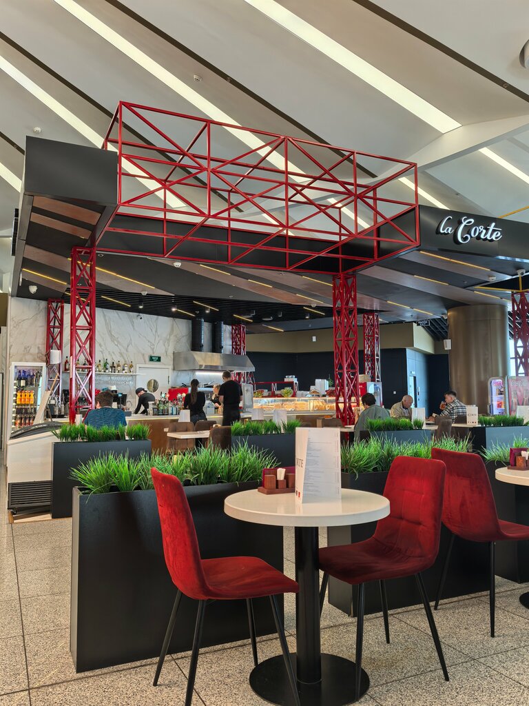 Заказал пасту карбонара, потому что очень её люблю. В итоге ел самую не вкусную пасту за все свои 38 лет. - вкус: уровень региональной столовой, а цена как в ресторане (понятно что аэропорт). Но делает скидку на то паста должна быть отвратной. Деньги обратно не просил, не ругался. Какая то не понятная приправа, которая весь вкус пасты перебила. Соус даже не хочу спрашивать из чего был. Съел, потом что ближайший прием пищи будет через 7 часов. - чистота на кухне: Посмотрите на эту духовку, её хоть вообще мыли? Видно нет - пока ждал заказ, повар 4 раза руками без перчаток залазила в заготовку и ела колбасу (слава богу не облизывала руку после этого) - салфеток за столиком нет, пришлось самому брать с соседнего столика. Крайне не рекомендую заведение!