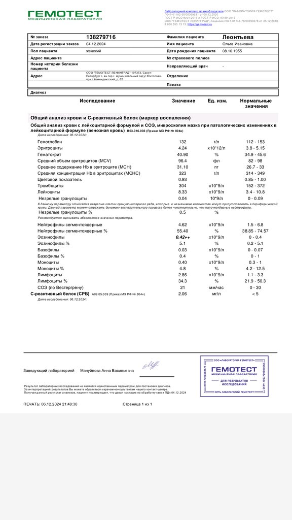 Очень быстро получила услугу, приняли даже раньше записанного времени. Персонал вежливый, медсестра провела манипуляцию профессионально, синяков на вене не осталось. Результат анализа на почте через 12 часов.