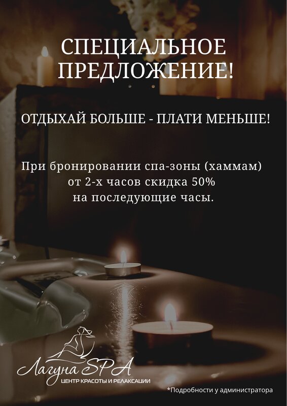 Лагуна стала для меня открытием. Друзья на день рождения подарили сертификат на сумму. Решила выбрать спа-программу. Позвонила на ресепшен, подобрали спа без проблем. Порадовало всё: вежливый и тактичный персонал; чистое и уютное пространство, разнообразие услуг — выбрала релакс массаж и пилинг в спа, обе процедуры выполнены профессионально; комфортная температура в помещении и бонус в виде ароматного чая с конфетками порадовал🙂 После сеанса ушла с ощущением гармонии и свежести. Однозначно буду приходить снова исоветовать друзьям!