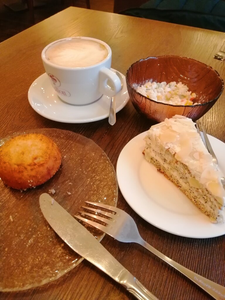 Персонал вежливый. Атмосфера достаточно уютная. Время ожидания блюда около 15 мин. Интерьер незамысловатый. Брали кофе, чай, пирожные, пасту, салаты и котлети из картошки с мясом. Все понравилось, было вкусно и не дорого. Каждый заплатил около 300-400 руб. На фото еда за 1 счёт, за минусом 1 котлеты. За время пока сидели видели как 2 гостя праздновали день рожденье. По меня есть много чего: пельмени, пасты, бургер, пирожение, пироги, салаты,шпмпанское,вино и т.д. У некоторых столиков есть разметки, можно зарядить телефон. Туалеты чистые, туалетная бумага есть. Из минусов только то, что в кафе прохладно. Пришли бы сюда ещё раз