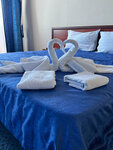 Отдыхали в сентябре всей семьей. Нас пять человек. Номер чистый, две комнаты, два балкона один из них с видом на море, в номере все удобства, чайник, два телевизора, холодильник, две Сплит системы, тарелки, кружки, стаканы все есть. Номер большой. Единственное номер напоминает Совдеп, но это никак не омрачает. Завтрак порционный и правильный, кашка, чай. Парковки нет, досадно, но мы договорились с соседкой и она нас пустила к себе в гараж за 500 рублей сутки. Бассейн не подогреваемый, а хотелось бы! Есть мангальная зона