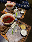Борщ подается с салом,чесноком, бородинским хлебом, сметаной и горчицей