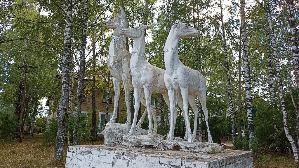 Спорная скульптура-то ли три лесных оленя,то ли три лани.Но скульптуры в натуральную величину животных,и на своём месте.Скульптура стоит в кустарнике неухоженном в начале улицы Пушкина,недалеко от улицы Губкина,где имеется,автостоянка с великолепным видом на пойму реки Ухта.Можно поставить машину на край стоянки и не выходя из машины любоваться северной природой и противоположным берегом реки.