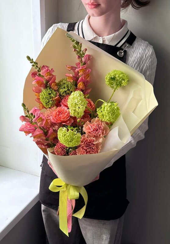 Авторский весенний букет, созданный для подъема настроения. Нежная композиция в розовых тонах с пышными ранункулюсами, изящными диантусами, альстромерией и декоративным эвкалиптом. Идеальный подарок, чтобы вызвать улыбку и ощущение свежести.