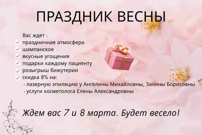 ✨ Праздничные дни 7–8 марта: угощения, подарки и скидки! ✨ В центре красоты Laser Home наступают настоящие дни весны — 7 и 8 марта мы пригл...