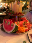 Очень профессионально разводят на фруктовой тарелке, хочешь немного фруктов, а получаешь подрезанный целый арбуз, дыню, виноград и ещё много всего. И платишь за неё почти 2500. В общем заведение понравилось, музыка , кухня на отлично. Работает до последнего клиента, очень вежливые официанты, девушки на входе уставшие, у них автоматически закатываются глаза под лоб, при виде посетителей. На самом деле все понравилось, прийду ещё 👍