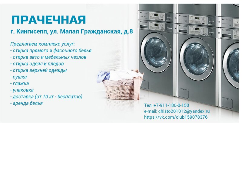 Замечательная прачечная! Всем советую! Цена и качество! В Кингисеппе лучше - нет! Спасибо сотрудникам и руководству! 👍✌