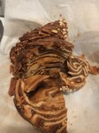 Взяли рулет со сгущёнкой и грецким орехом, 480г вышло на 420 рублей. Ожидалось, что это будет качественное изделие из натуральных ингредиентов. Но ожидания не оправдались, на вкус отвратительно, явно есть и маргарин, и заменитель вареной сгущёнки, желудок потом болел. Ценник высокий, а качество низкое, никому не рекомендую тратить деньги на такое, отправили в мусорку...