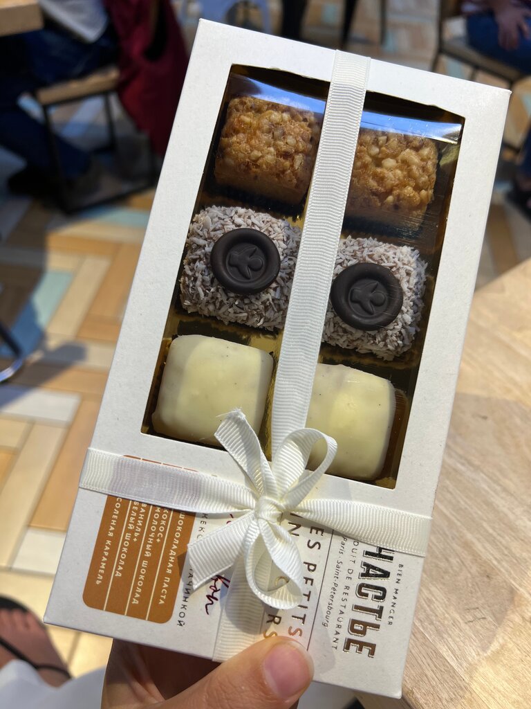 Ребята официанты общаются с тобой, как с другом, которого давно ждали в гости. Люблю брать здесь трюфели и домашнее печенье, кексы. Последний раз брала на подарок, потому что упаковка и качество продукта такие, что такое дарить не только не стыдно, но и гордо: в Петербурге делают такие сладости. В общем, продолжаю приобщать своих к сладостям из счастья.