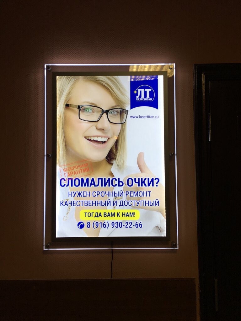 Хочу всем посоветовать по ремонту очков или бижутерии обращаться только в Лазертитан! Мастерская расположена очень удачно, внутри тепло и чисто. Взяли на ремонт мои очки. Стоимость вышла не высокая. Сделано хорошо.Огромное вам спасибо.