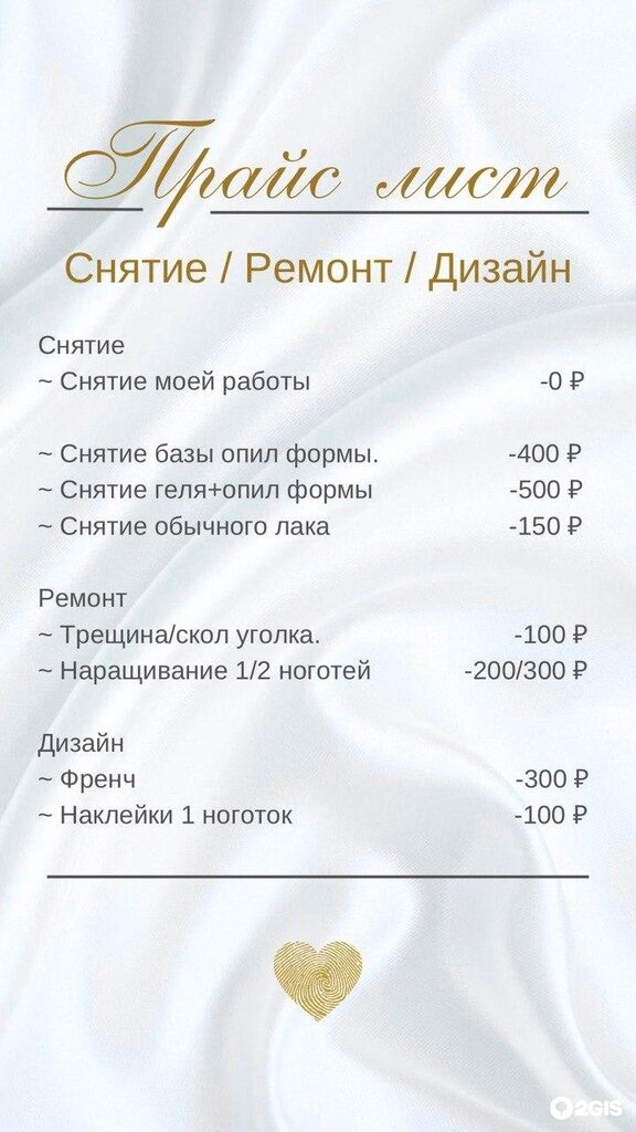 Nail procedures:female pedicure, women's manicure, male manicure, men's pedicure, permanent manicures, nail design, paraffinotherapy, children's manicure, spa manicure, hardware pedicure, hardware manicure, combi manicure, combi pedicure, smart-pedicure