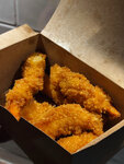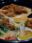 Куриный бульон, плавленый сыр, маринованное яйцо, шампиньоны, филе в остром кляре, зеленый лук, сыр гауда, пшеничная лапша.