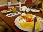 Средненький. И по качеству блюд, и по ценам. Завтрак стандартный шведский стол, каши, сосиски, омлет, сырники. Обеденный зал выглядит совсем не так, как на фото. У них есть еще банкетный, но клиентов гостиницы в него не пускают, даже вечером. Хотели устроить перед отъездом там прощальный ужин, но не рискнули, уж больно серо выглядит зал.