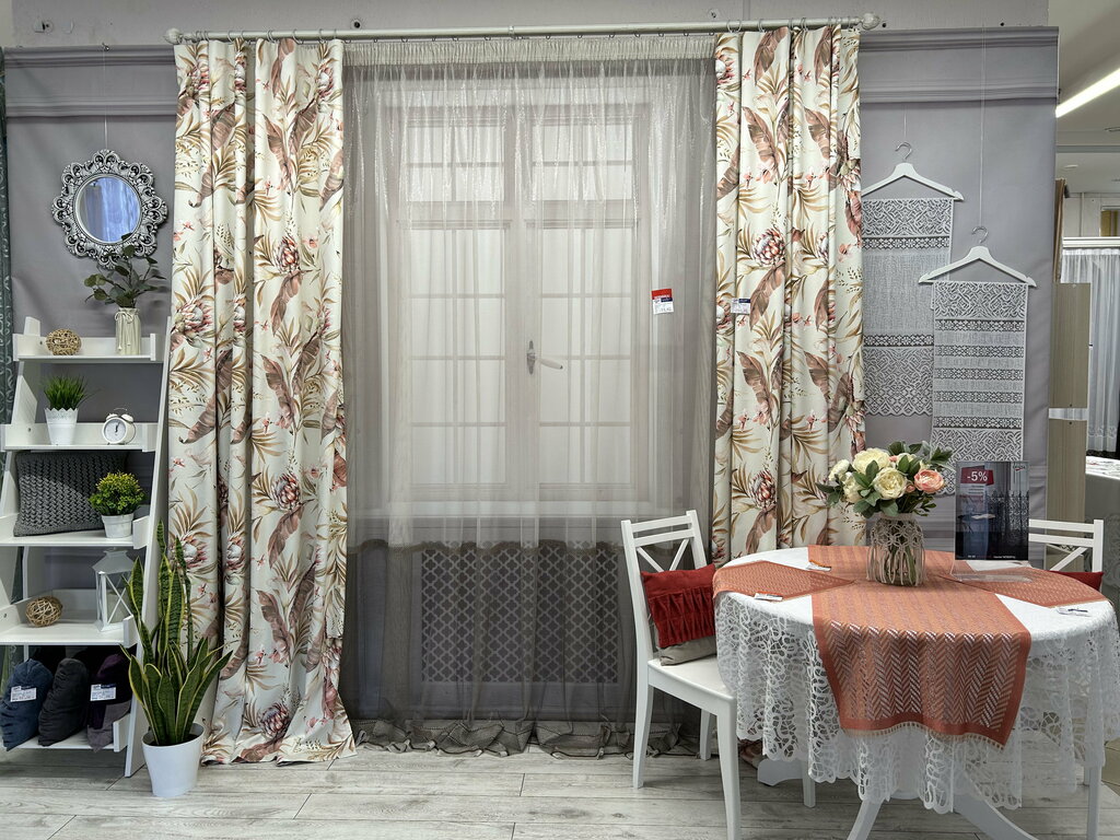 It's a great store. With an excellent assortment. I bought curtains there myself. I chose what I wanted. You can pick up a ready-made kit. It can be cut-off. A spacious hall. Reasonable prices. By the way, the material itself is well erased. Because it consists, as a rule, of natural fibers. Unlike plastic materials. Such curtains, especially curtains, should be washed in hot water and that's it. The curtain shrank. I want to share my experience of using PVC materials. The glass kitchen table was covered with a PVC tablecloth. It looks like a high-quality tablecloth with a peculiar pattern. I decided to wash the tablecloth. I started to take it off, but it stuck to the table. I took it off. The whole table is covered with a sticky substance. The first thought is fat. But how did he get there? I started to find out what was the matter and found out. A tablecloth made of such a material releases sticky oils upon prolonged contact with a hard surface. The table was somehow cleaned, but the tablecloth was missing. I let him do it three times. It's the same with the bathroom curtain. Couldn't be cleaned. I let him do it three times. Now I have purchased a cloth-based tablecloth for the kitchen that does not emit any oils. To the bathroom, I also bought a curtain on a different basis. This once again shows the practicality of natural materials compared to plastic.