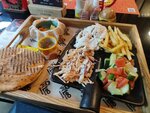 Эта шаверма — настоящий кулинарный шедевр, который пленяет не только вкусом, но и оригинальной подачей! Вместо привычной тарелки всё было сервировано на лопате, что добавило блюду шарма и определённой дерзости. Сочетание нежного мяса с насыщенным соусом, хрустящей картошки фри и свежих овощей оказалось безупречно сбалансированным. Каждый ингредиент буквально кричит о своей свежести и качестве. Румяные, горячие лепёшки идеально дополняют блюдо, превращая трапезу в нечто особенное. А яркие акценты вроде маринованных овощей и острого перчика придают блюду нотку пикантности. Отдельно стоит отметить текстуры: от мягкости лепёшек до хруста картофеля и сочности салата — всё продумано до мельчайших деталей. Эта шаверма — не просто еда, это настоящее удовольствие, которое хочется повторить. Отличное сочетание вкуса, креативности и подачи!