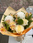 Цветочки свежие, хризантемы шапочкой очень ароматные. Флорист (по-моему, Екатерина) нас безумно выручила, мы прибежали в дикой спешке, очень торопили, но она смогла буквально за 20 минут собрать нам 2 шикарных букета. Сборка очень современная, цветовая гамма классная, все пожелания учли. Безумно нас выручили, спасибо огромное!!