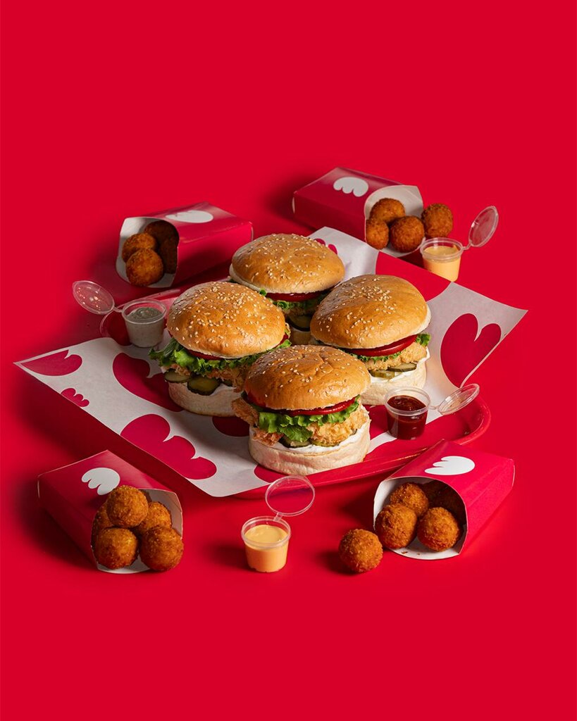 Мягкая булочка, нежное куриное филе в фирменной панировке, свежие помидоры, маринованные огурцы, салатные листья, соусы майонез и чили