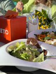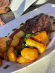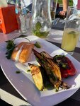 We celebrated the DR in May, we pre-ordered a table and a menu. We arrived at the appointed time, the agreed tables were waiting for us, it was set directly in front of us, everything was fresh, delicious, the serving was beautiful. We took caesar, hot (fish and beef steak) - delicious, not dry, which is the main thing. The side dish for the hot is purchased separately. Snacks (carpaccio, cheese plate, fruit, meat) - delicious, but we were also lucky with the service, the waiter guy worked well, cheerful. According to the ordered list, everything was served on time, only the hot was delayed for half an hour approximately exactly. The territory is beautiful, near the water, yachts, sailing boats, but the entrance to the territory is 2p / person or 1 car entrance to the territory = 10p (even if you ride a yacht or in a cafe). Parking is available nearby for free or for a fee on site. The furniture is of course already shabby. There is a terrace or a covered part in case of rain. The prices of food are average, drinks are expensive, including non-alcoholic, alcohol is expensive everywhere, everyone is already used to this. I recommend a place to visit. Beautiful, delicious! The pool and so on are paid separately (find out in advance who needs it). It is convenient with children, there is a children's island next to the terrace (slide, swing). I was pleased that all the drinks were cold. Grilled vegetables, namely zucchini, are somewhat damp, but delicious, we ate everything. Snack - dried tomatoes - also delicious, try it. The cafe itself looks simple and ordinary, but the location is chosen correctly, very beautiful sunsets 🌅 It's worth even getting out for a glass in the evening