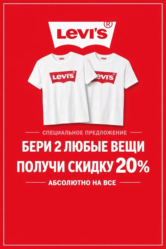 Levi's®: -20% на всё. Даже на то, что и так со скидкой 🔥 С 02 по 09 марта в магазине Levi’s акция: берете от 2-х вещей и получаете скидку ...