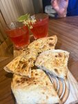 Азиатский вариант классического блюда. Тесто в форме лодочки с сырами сулугуни, моцарелла и соусом том ям, запекается в печи до хрустящей корочки, подается с креветками, томатами черри и лаймом, украшается кинзой.