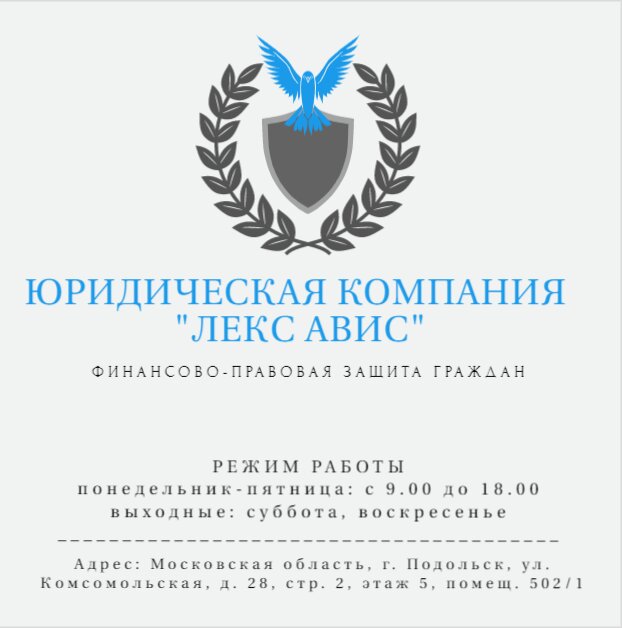Здавствуйте! Юридическая компания " ЛЕКС АВИС" Очень мне помогла в оформлении банкротства. Всегда интересовались как у меня дела и вели дело до окончания процесса. Очень проффесиональные и знающие свое дело. Спасибо что я к ним обратился. Если мне понадобится юридическая помощь обязательно обращусь к ним.